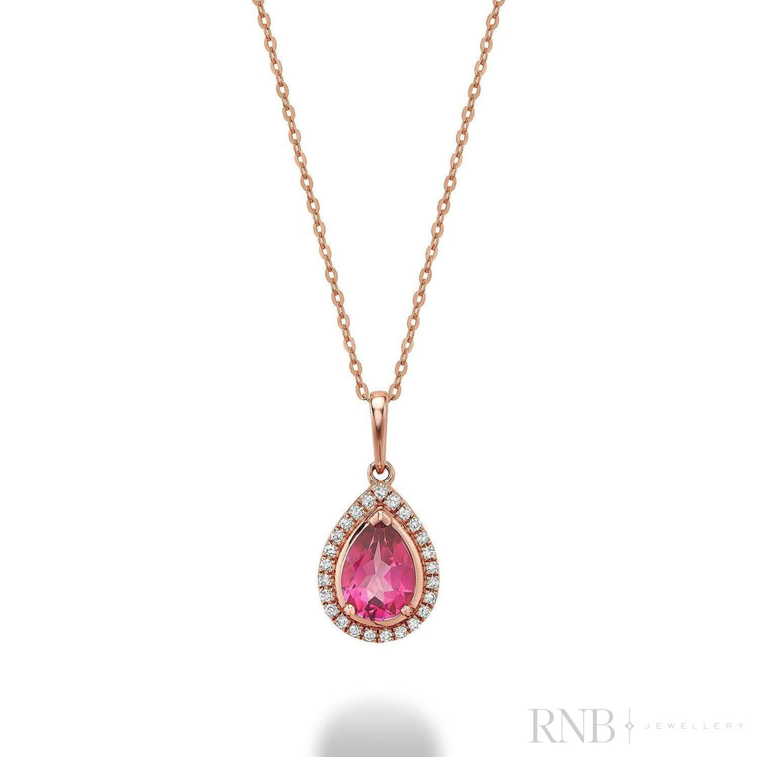 10k Rose Gold Pear Shaped Pink Topaz Diamond Halo Necklace